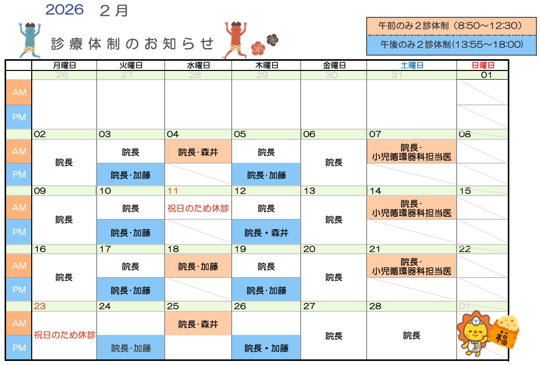2月は以下の日程で非常勤医師との二診体制を予定しております⛄